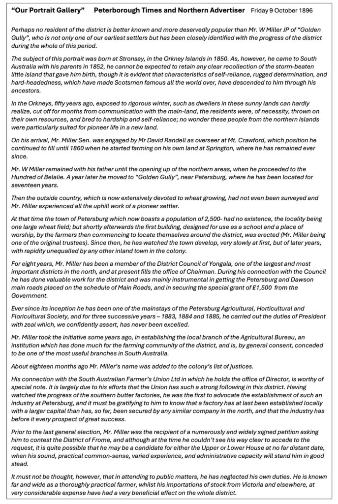 An article published in the Peterborough Times in 1896 chronicles William Miller’s achievements and contribution to the district and the State more generally. It is clear of the esteem in which he is held and is reproduced below.